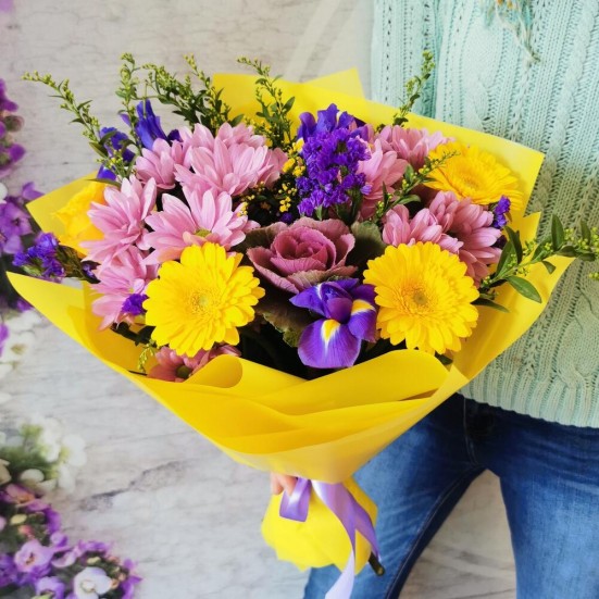 Букет с ирисами и хризантемами и герберами