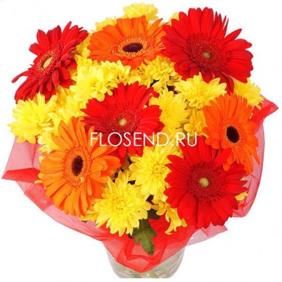 Букет из красных гербер и желтых хризантем