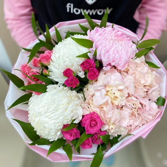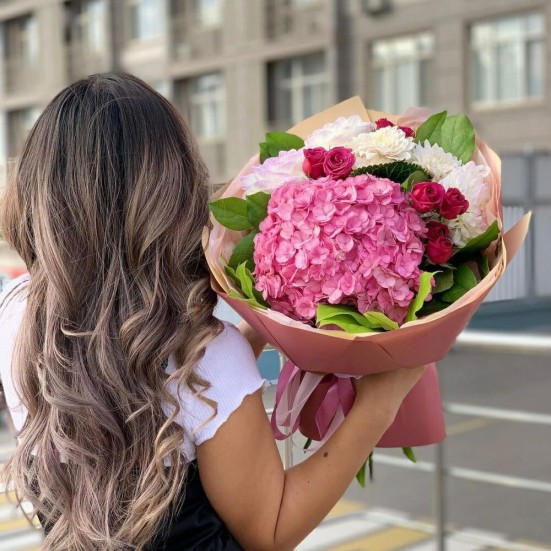 Букет розовые розы и розовая гортензия в Королёве
